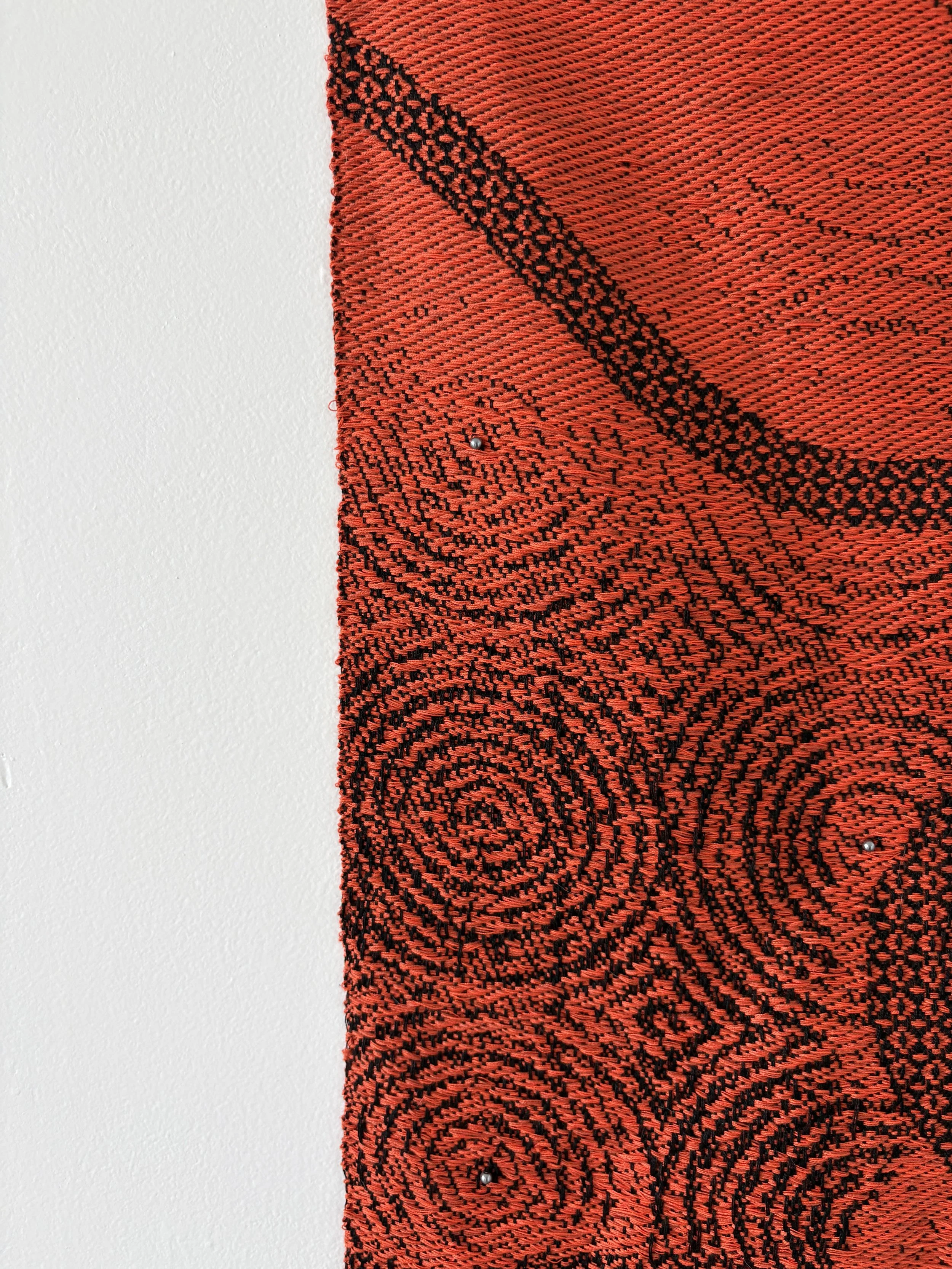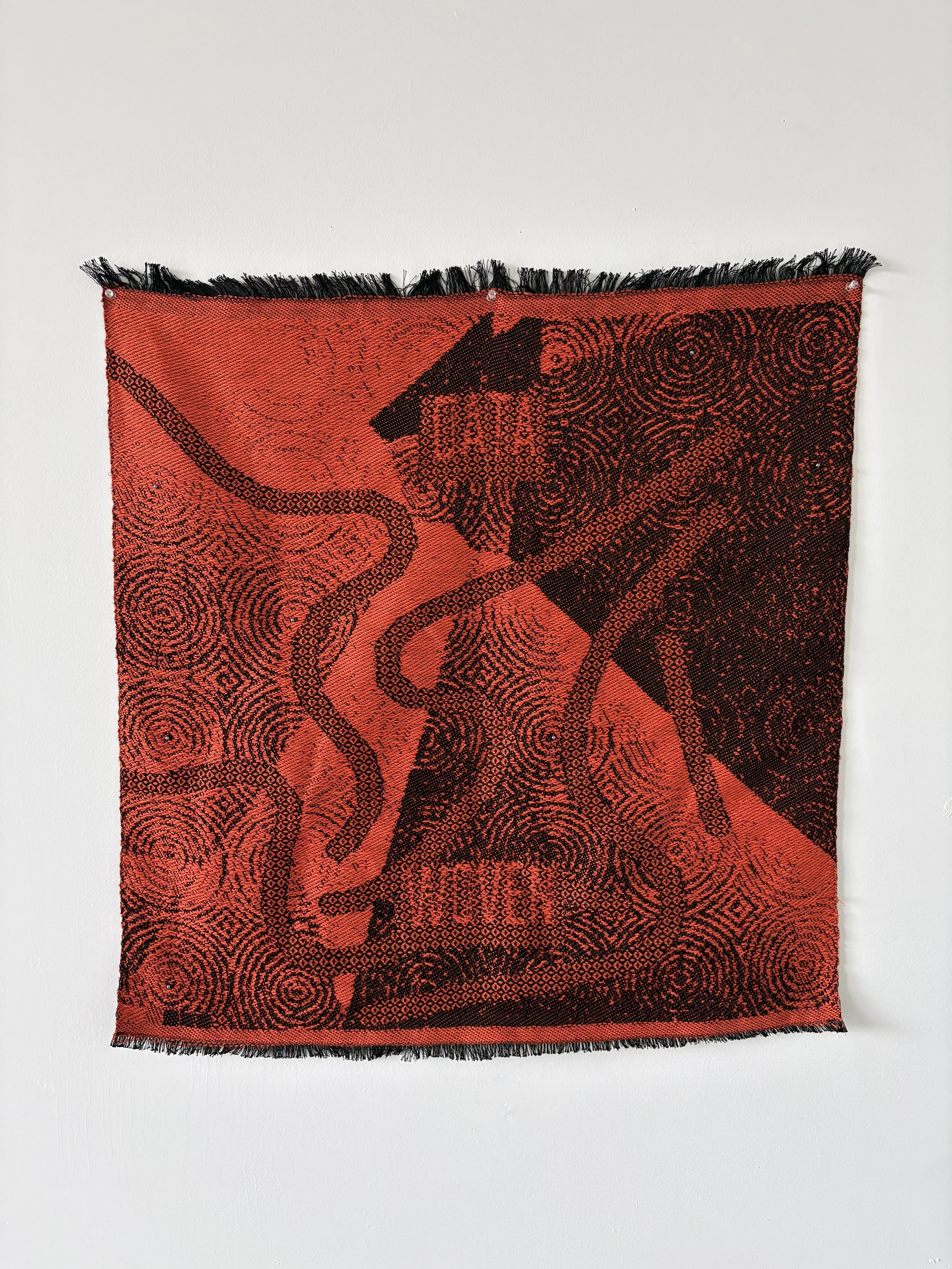 This artwork, which is part of an extended series of weavings on a AVL Jacquard Loom, is composed of digital scraps that I’ve collected over the years – screenshots, speculative narratives and bits of text – and explores what is to be gleaned from the missing pieces in queer digital archives; approaching the lack of information to speculate what can exist.